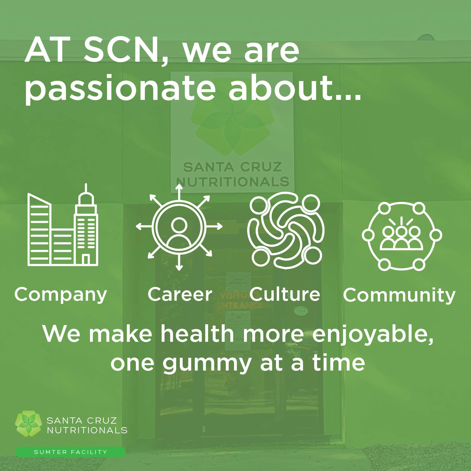 Santa Cruz Nutritionals (SCN) is the leading contract manufacturer of enhanced confectionery delivery systems for the functional food and nutraceutical markets. I worked with Axiom Consulting Partners to assist SCN on creating hiring materials to promote their open career opportunities and what the company has to offer.